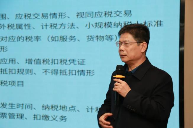 培训中,高建华老师先展开深度分享。他聚焦《中华人民共和国增值税法》及《实施条例》的关键条款与重大修订,围绕企业普遍关注的一般纳税人认定管理、应税交易界定、纳税范围调整、税率结构优化、进项税额抵扣规则、税收优惠政策更新、纳税义务发生时间确认及发票管理规范等核心内容,结合企业日常经营与重大交易中的典型涉税场景,进行了系统梳理与细致解读,提供了兼具针对性与可操作性的实务解决方案。