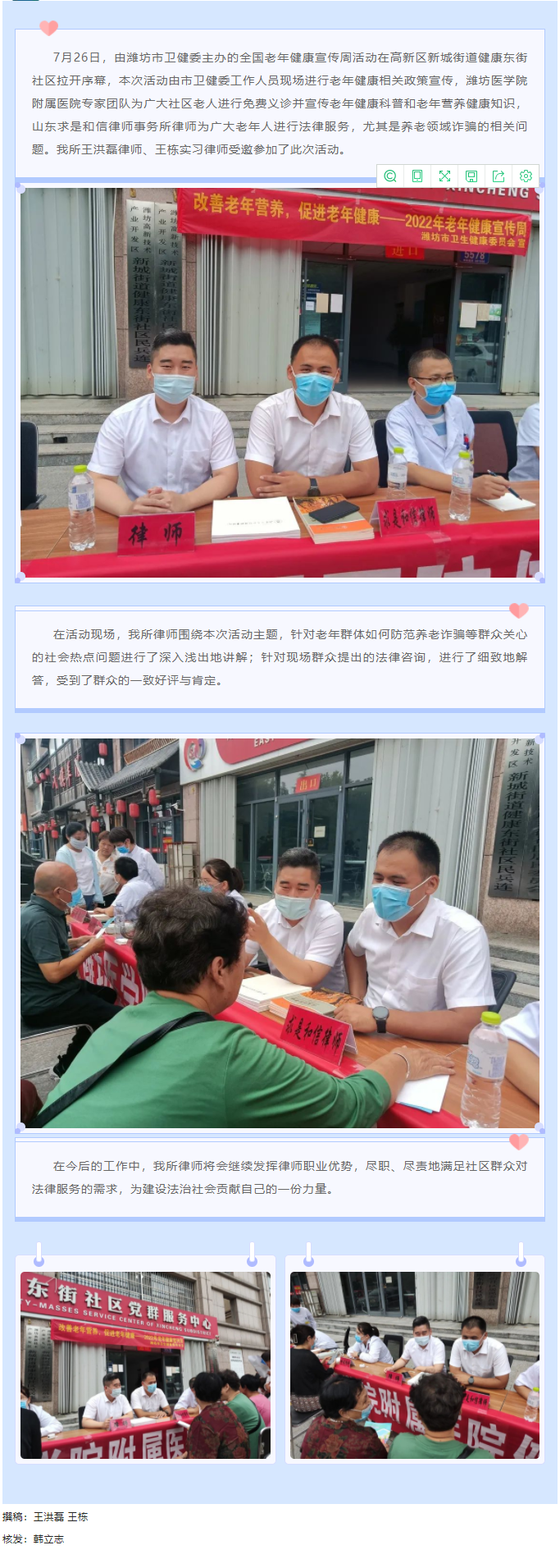 做党和人民满意的好律师 | 我所律师受邀参加“全国老年健康宣传周”防范养老诈骗公益宣传服务活动 来源:求是和信网 日期:2022-07-26 10:27 发布人:qshx 浏览量: 1644 上一篇:做党和人民满意的好律师|我所姜晓然律师做客潍坊新闻广播“法治时空”节目 下一篇:求是和信涉外法律服务之路