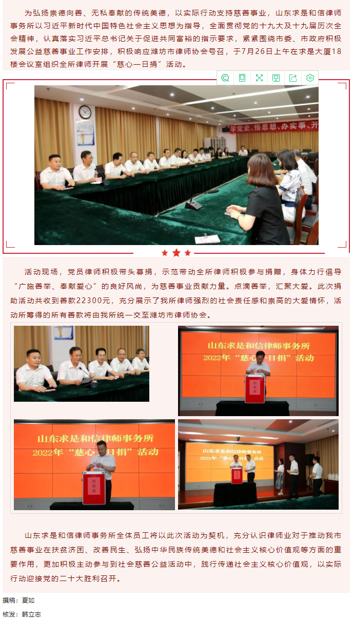 做党和人民满意的好律师 | 山东求是和信律师事务所开展“慈心一日捐”活动 来源:求是和信网 日期:2022-07-28 08:37 发布人:qshx 浏览量: 1608 上一篇:做党和人民满意的好律师 | 我所律师受邀参加“全国老年健康宣传周”防范养老诈骗公益宣传服务活动 下一篇:求是和信涉外法律服务之路