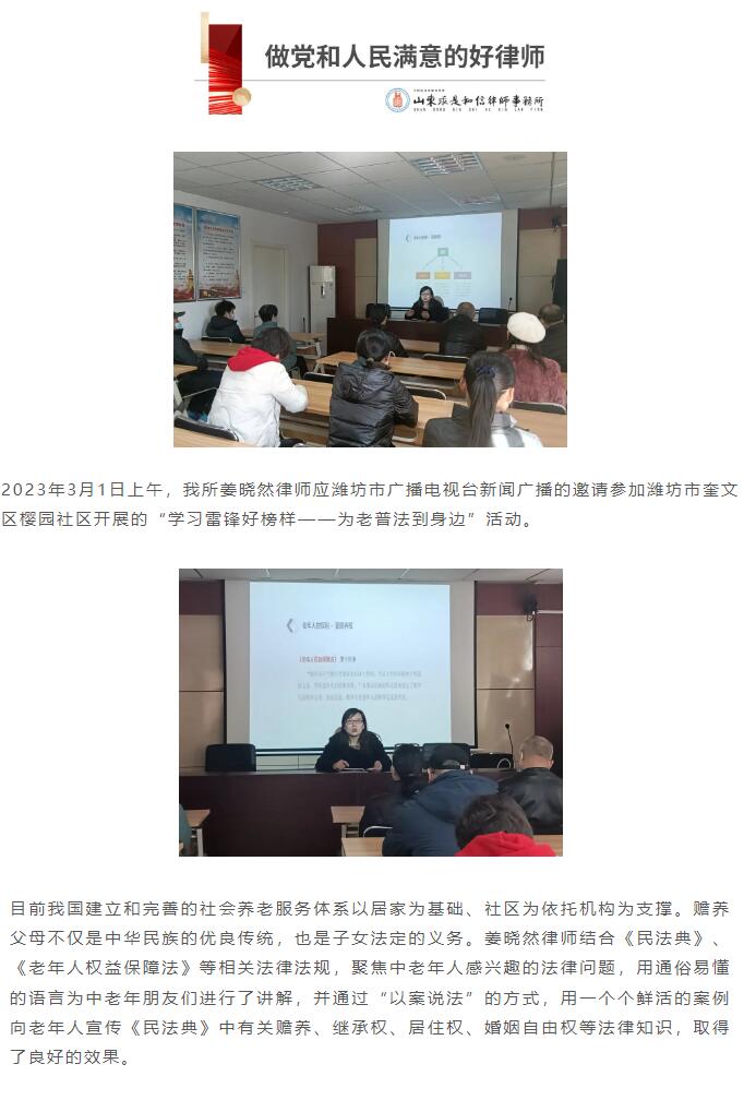 做党和人民满意的好律师 | 姜晓然律师应邀参加潍坊市广播电视台新闻广播举办的“学习雷锋好榜样——为老普法到身边”活动 来源:求是和信网 日期:2023-03-02 14:20 发布人:qshx 浏览量: 1757 上一篇:求是和信律师为新城街道蓉花路社区物业公开日活动提供法律服务 下一篇:求是和信涉外法律服务之路
