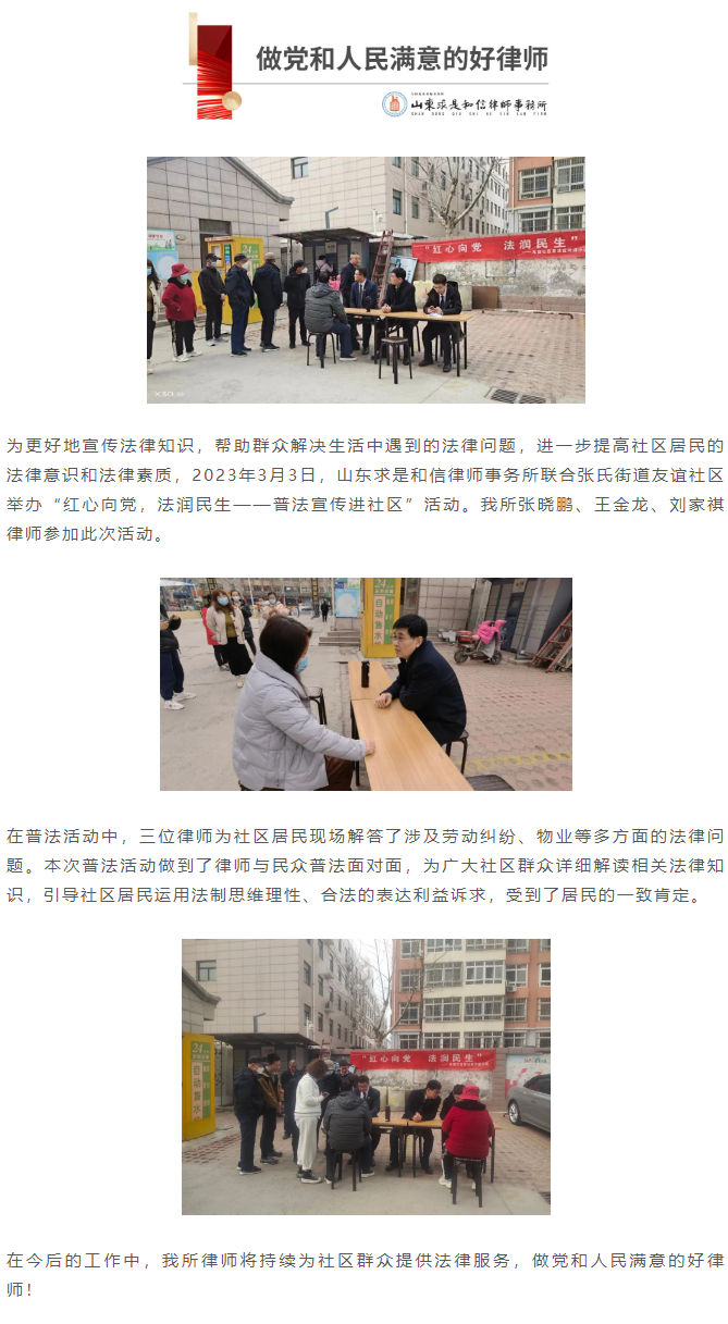 求是和信律师参加张氏街道友谊社区“红心向党,法润民生——普法宣传进社区”活动 来源:求是和信网 日期:2023-03-03 14:24 发布人:qshx 浏览量: 1850 上一篇:做党和人民满意的好律师 | 姜晓然律师应邀参加潍坊市广播电视台新闻广播举办的“学习雷锋好榜样——为老普法到身边”活动 下一篇:求是和信涉外法律服务之路