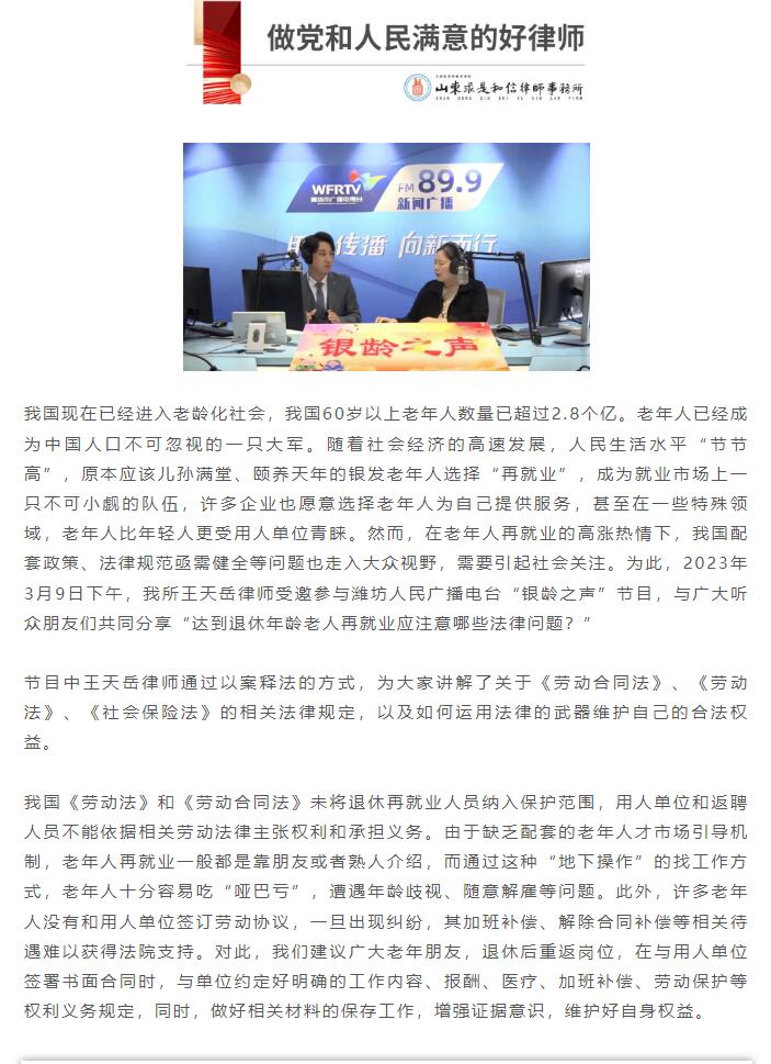 王天岳律师做客潍坊人民广播电台“银龄之声”节目 来源:求是和信网 日期:2023-03-11 15:10 发布人:qshx 浏览量: 1826 上一篇:姜晓然律师应邀参加潍坊市第二人民医院“庆三八”妇女权益保护的活动 下一篇:求是和信涉外法律服务之路