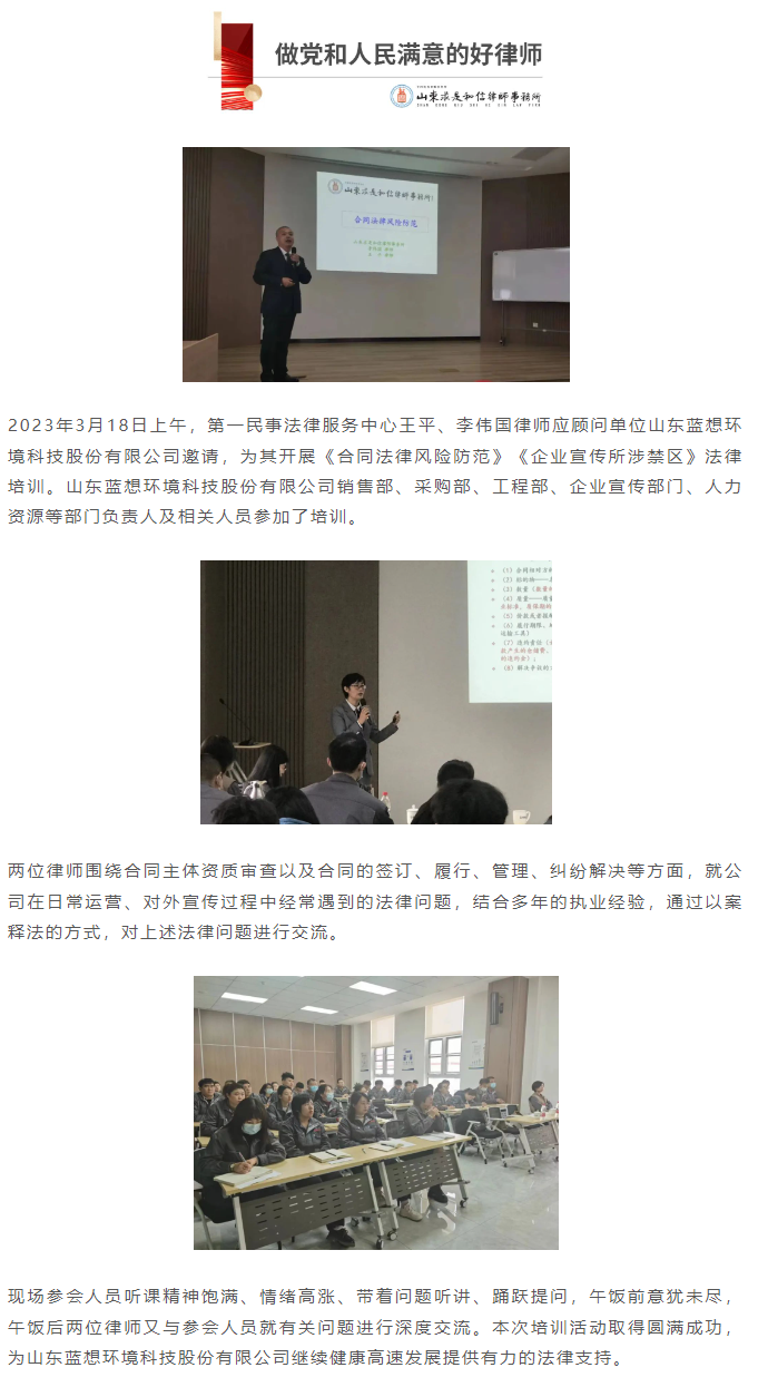 王平、李伟国律师应邀为山东蓝想环境科技股份有限公司作法律培训 来源:求是和信网 日期:2023-03-17 15:30 发布人:qshx 浏览量: 2179 上一篇:王天岳律师做客潍坊人民广播电台“银龄之声”节目 下一篇:求是和信涉外法律服务之路