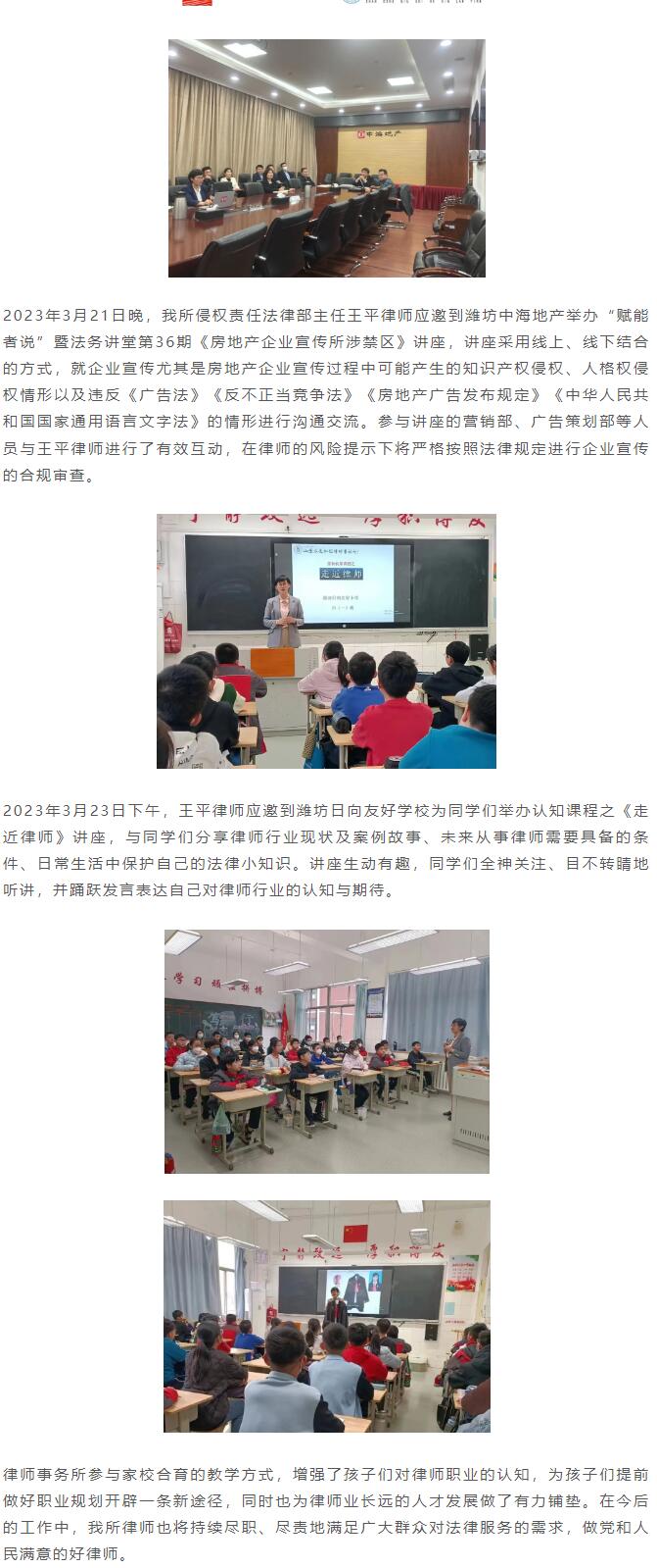 王平律师应邀到中海地产、潍坊日向友好学校举办讲座 来源:求是和信网 日期:2023-03-24 15:40 发布人:qshx 浏览量: 2031 上一篇:求是和信律师做客潍坊市广播电视台新闻频道“法治时空”栏目 下一篇:求是和信涉外法律服务之路