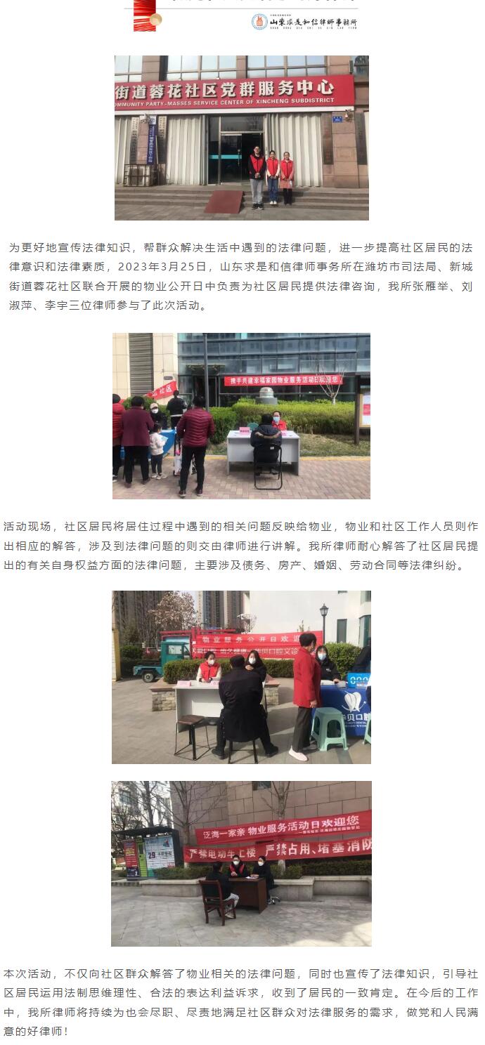 求是和信律师为新城街道蓉花社区物业公开日活动提供法律服务 来源:求是和信网 日期:2023-03-27 15:48 发布人:qshx 浏览量: 1319 上一篇:王秋文律师受邀参加坊子区自然资源与规划分局举办的送法下乡坊城专场活动 下一篇:求是和信涉外法律服务之路