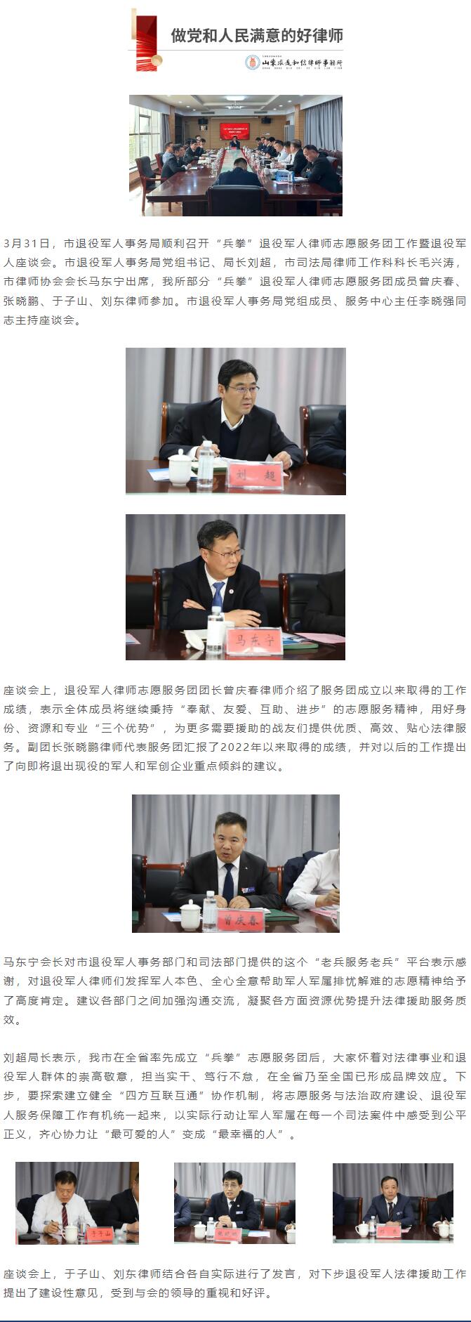 我所律师参加“兵拳”退役军人律师志愿服务团工作暨退役军人座谈会 来源:求是和信网 日期:2023-04-17 16:10 发布人:qshx 浏览量: 1668 上一篇: 张淑霞律师应邀为山东海化集团做女职工法律知识培训 下一篇:求是和信涉外法律服务之路