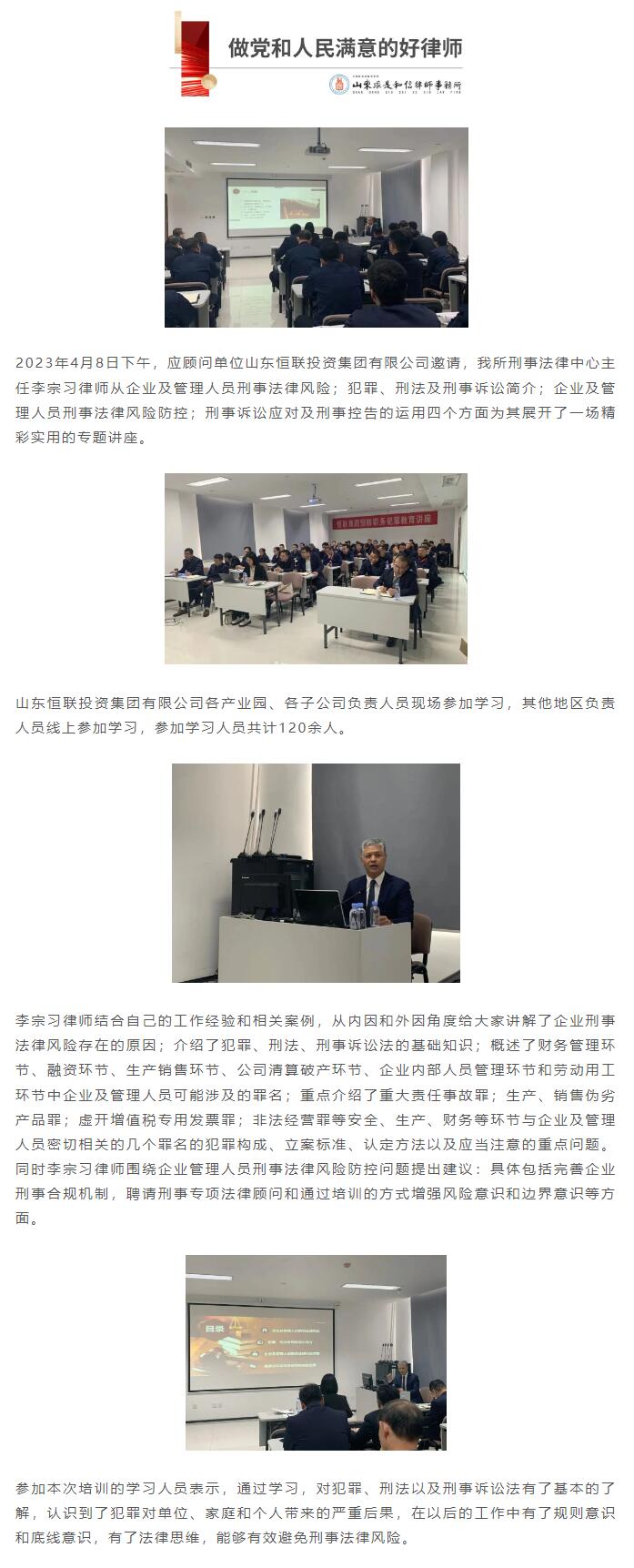 李宗习律师应邀为山东恒联投资集团有限公司开展《企业及管理人员刑事法律风险防控》培训讲座 来源:求是和信网 日期:2023-04-17 16:12 发布人:qshx 浏览量: 1777 上一篇:我所律师参加“兵拳”退役军人律师志愿服务团工作暨退役军人座谈会 下一篇:求是和信涉外法律服务之路