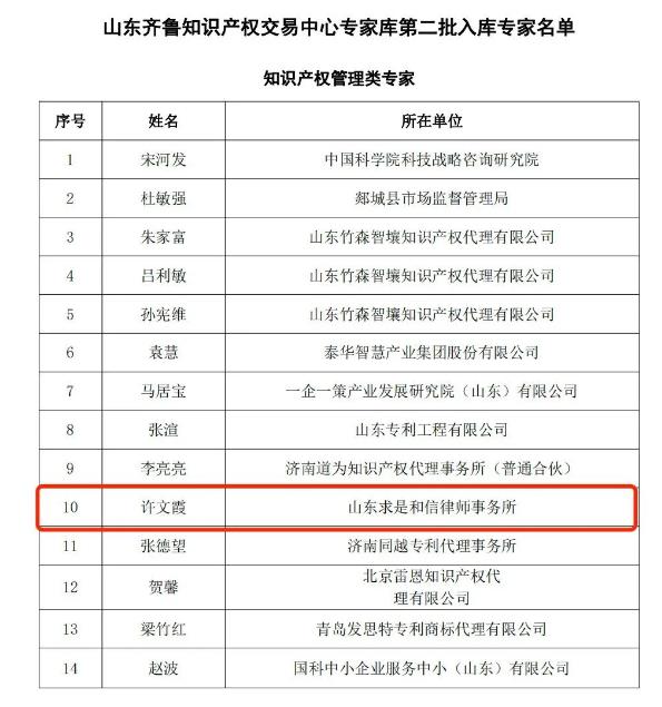 我所第二民事法律中心实习律师许文霞入选山东齐鲁知识产权交易中心专家库(第二批)