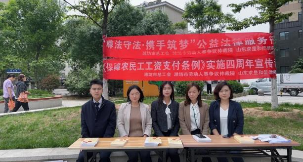 在五一劳动节到来之际,根据《中共潍坊市委、潍坊市人民政府转发<市委宣传部、市司法局关于在全市开展法治宣传教育的第八个五年规划 (2021-2025年)>的通知》和“谁执法谁普法”“谁管理谁普法”“谁服务谁普法”普法责任制的要求,为切实帮助职工群众提高法律意识和法治观念,4月28日上午,潍坊市总工会联合潍坊市劳动人事争议仲裁院和山东求是和信律师事务所前往高新区新城街道鸢都社区党群服务中心,开展了“尊法守法,携手筑梦”公益法律服务行动及《保障农民工工资支付条例》实施四周年宣传活动,向农民工、社区居民进行普法宣传。我所律师姜晓凤、张淑霞、马鸽、王玉珺、于文浩和王璐瑶(实习)参加了本次活动。