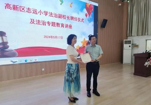 2024年5月17日上午,潍坊学院法学院副教授、我所兼职律师杨卫华与我所实习律师张俊涵受邀到潍坊市高新区志远小学参加法治副校长聘任仪式并进行法治讲座,杨卫华律师获聘为学校法治副校长,志远小学校长李祎为杨卫华律师颁发了聘书。