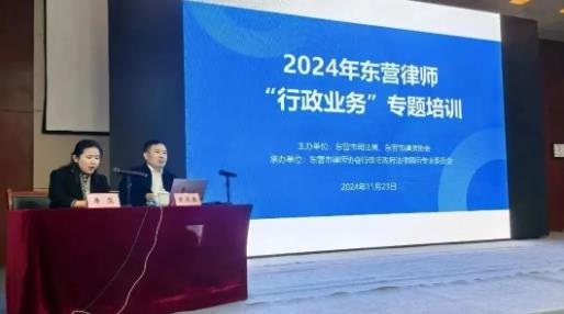 11月23日上午,东营市律师协会行政与政府法律顾问专业委员会在东营职业学院学术交流中心举办东营律师“行政业务”专题培训。我所合伙人会议主席、行政法律中心主任曾庆春律师受邀作“服务新质生产力发展行政法律师的新思维”主题授课,东营市律师协会副会长王读文、李蕊出席培训班,全市300余名执业律师、实习律师参加培训。