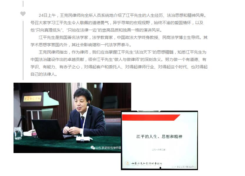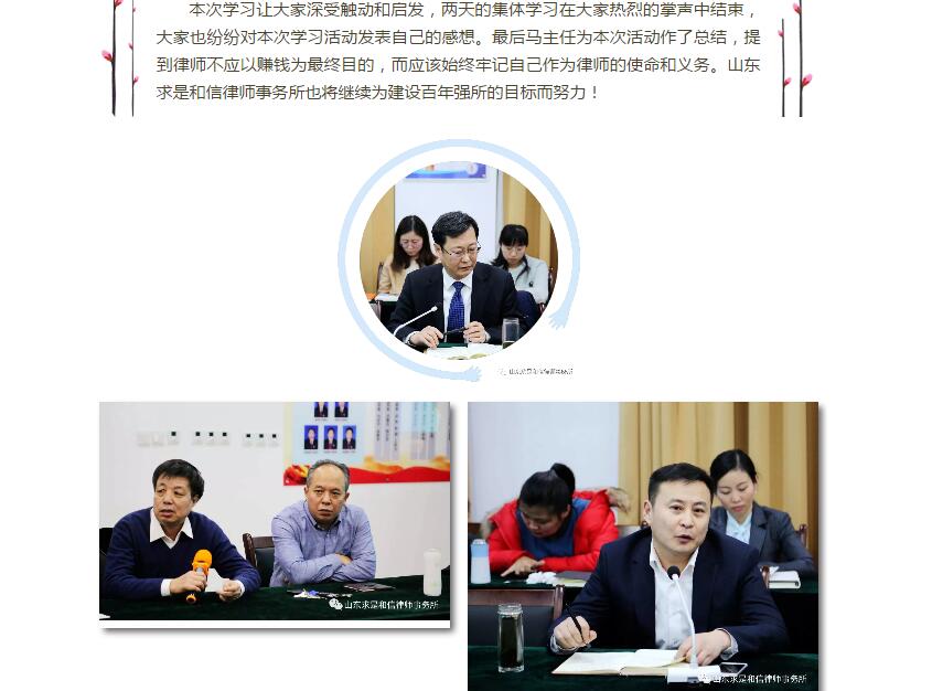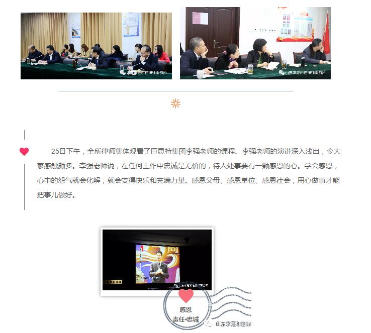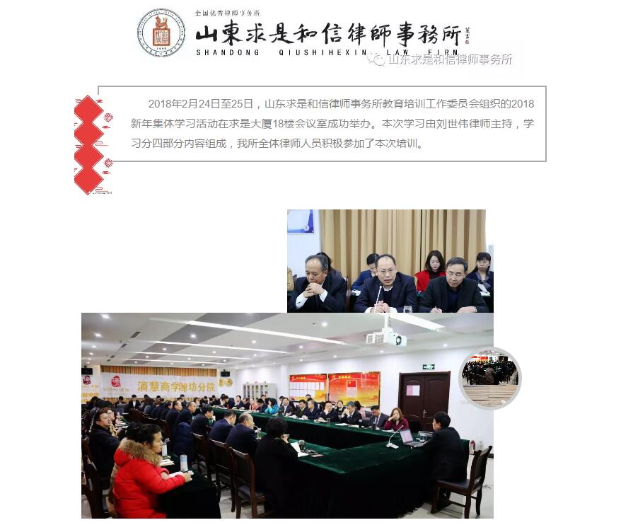 山东求是和信律师事务所举行2018新年集体学习活动 来源:求是和信网 日期:2018-03-05 11:54 发布人:qshx 浏览量: 1214 上一篇:山东求是和信律师事务所宿爱堂律师代理的全国首例“毒跑道”公益诉讼案被评为2017年推动法治进程十大案件之一 下一篇:求是动态 | 我所青年律师闪耀“大成杯”诉辩赛场 专业素养与团队协作铸就卓越战绩