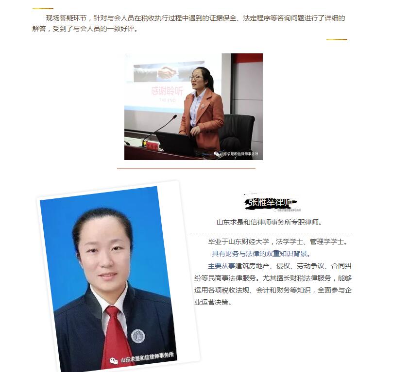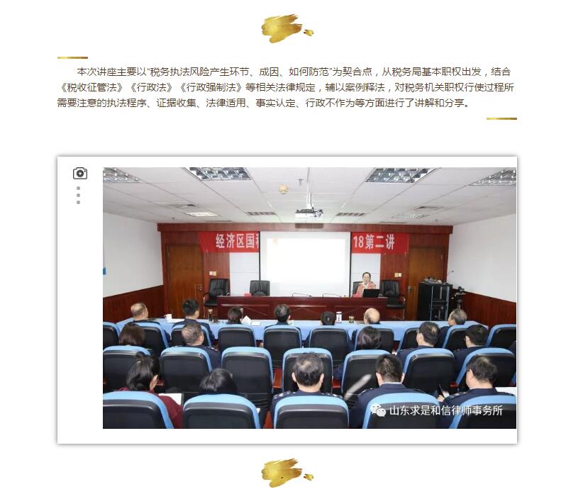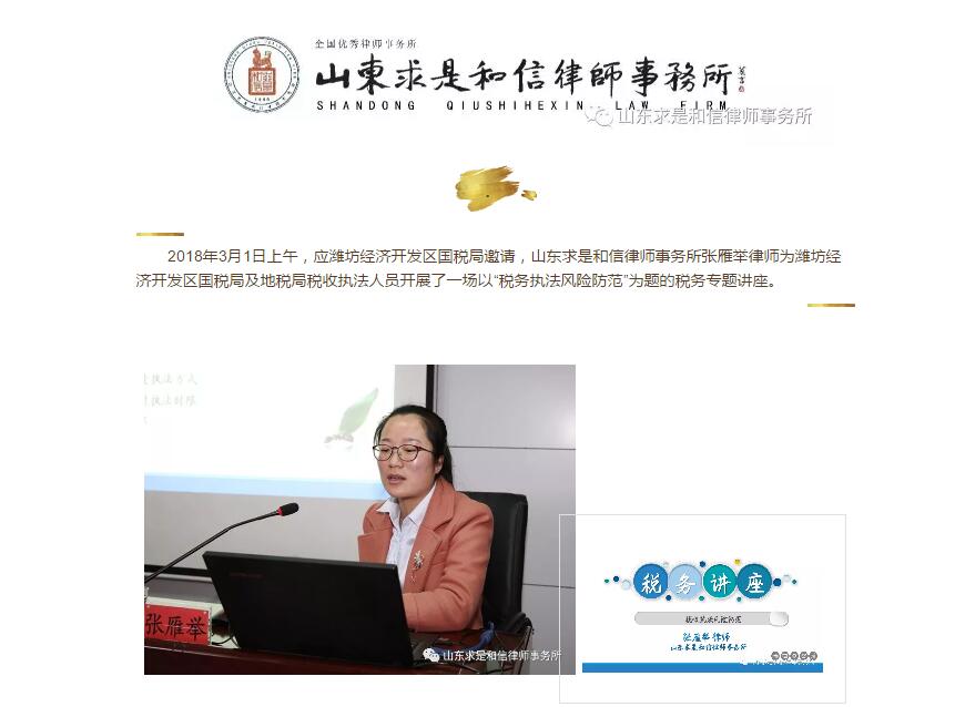 山东求是和信律师事务所张雁举律师为潍坊经济开发区国税局及地税局税收执法人员开展专题讲座 来源:求是和信网 日期:2018-03-05 14:00 发布人:qshx 浏览量: 869 上一篇:山东求是和信律师事务所举行2018新年集体学习活动 下一篇:求是动态 | 我所青年律师闪耀“大成杯”诉辩赛场 专业素养与团队协作铸就卓越战绩