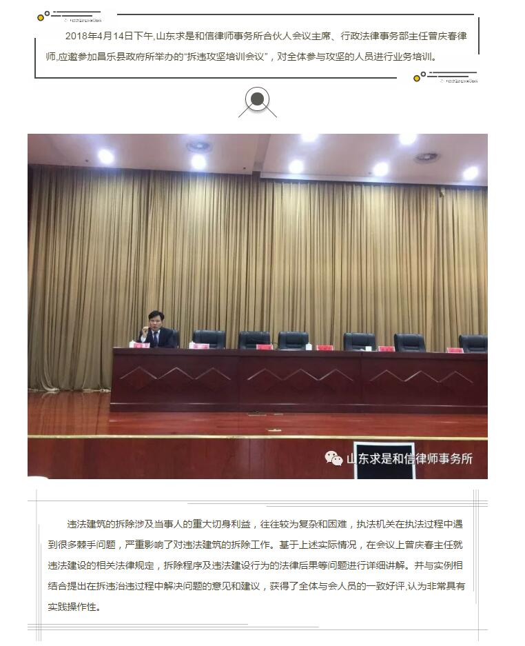 山东求是和信律师事务所曾庆春律师应邀为滨海经济开发区管委会进行法律授课 来源:求是和信网 日期:2018-04-23 09:37 发布人:qshx 浏览量: 894 上一篇:山东求是和信律师事务所行政法律事务部服务棚改项目(二):青州市弥河镇中黄山村棚户区 下一篇:求是动态 | 我所青年律师闪耀“大成杯”诉辩赛场 专业素养与团队协作铸就卓越战绩