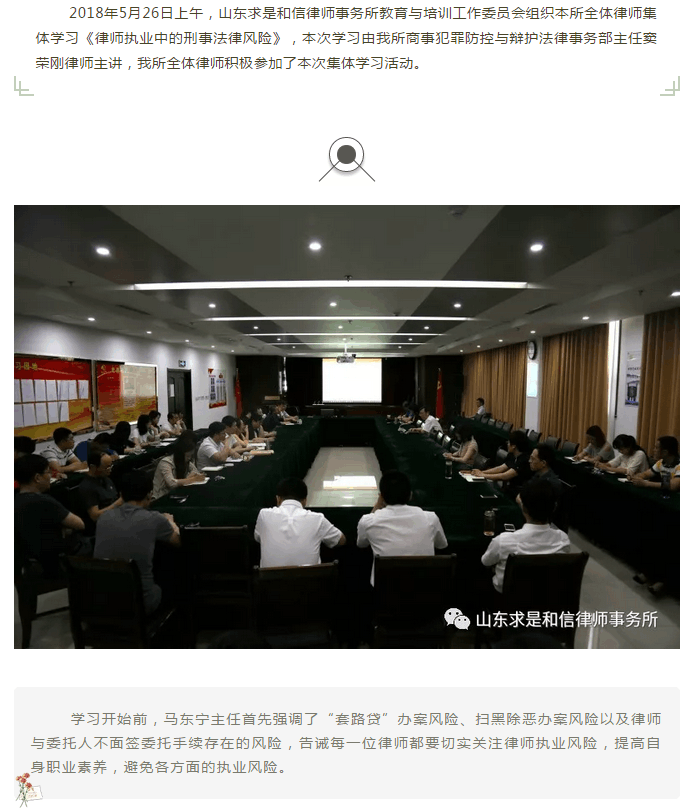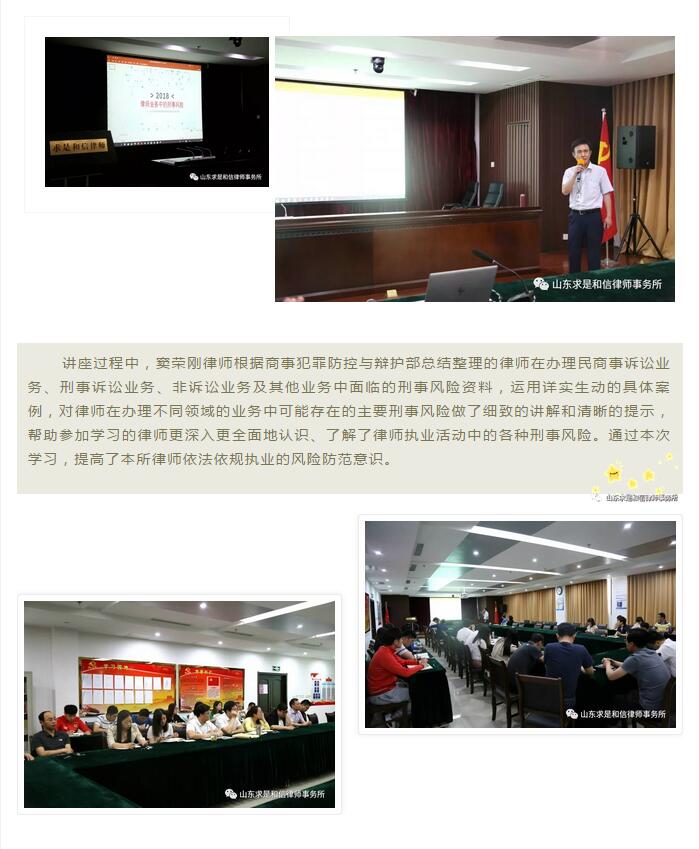 山东求是和信律师事务所窦荣刚律师为本所律师讲授《律师执业中的刑事法律风险》 来源:求是和信网 日期:2018-06-04 15:58 发布人:qshx 浏览量: 761 上一篇:日照市五莲县司法局领导携律所主任莅临山东求是和信律师事务所参观交流 下一篇:求是动态 | 我所青年律师闪耀“大成杯”诉辩赛场 专业素养与团队协作铸就卓越战绩