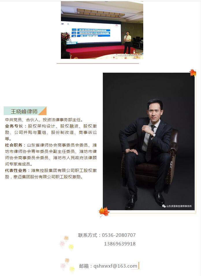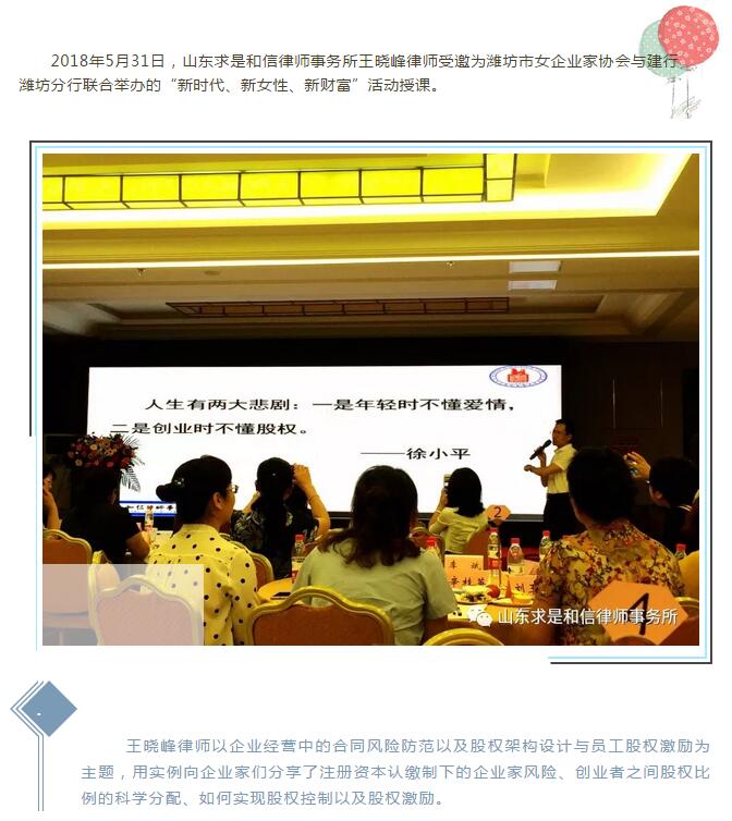 山东求是和信律师事务所王晓峰律师受邀为市女企协“新时代、新女性、新财富”活动授课 来源:求是和信网 日期:2018-06-04 16:04 发布人:qshx 浏览量: 883 上一篇:潍坊学院法学院领导与求是和信法学教育基金获奖学生到山东求是和信律师事务所参观交流 下一篇:求是动态 | 我所青年律师闪耀“大成杯”诉辩赛场 专业素养与团队协作铸就卓越战绩