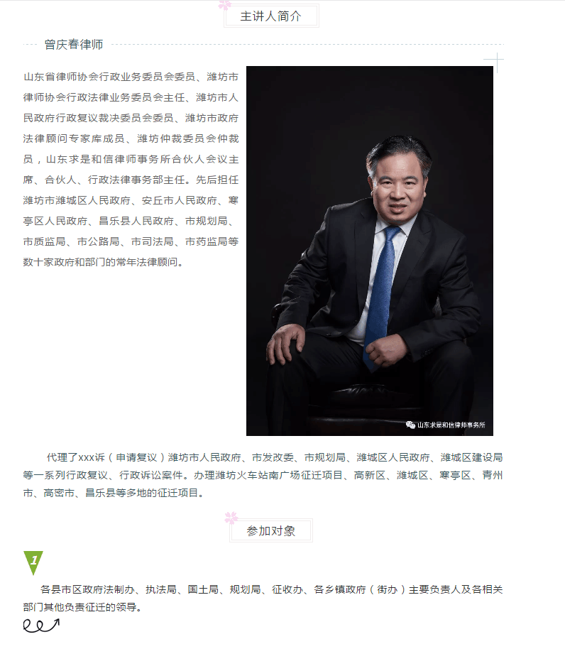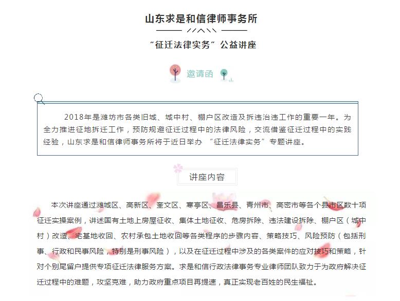 山东求是和信律师事务所 “征迁法律实务”公益讲座邀请函 来源:求是和信网 日期:2018-07-31 09:16 发布人:qshx 浏览量: 666 上一篇:山东求是和信律师事务所郝义华律师受邀为潍坊市住房置业担保有限公司授课 下一篇:求是动态 | 我所青年律师闪耀“大成杯”诉辩赛场 专业素养与团队协作铸就卓越战绩