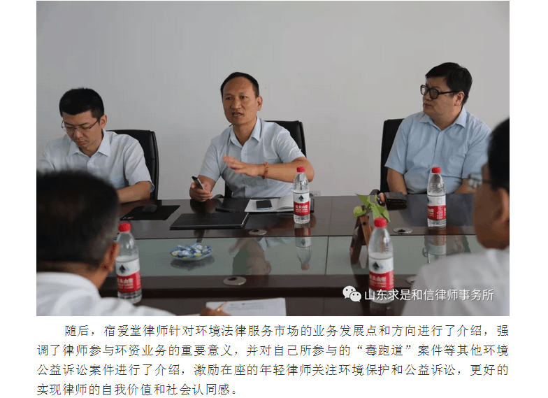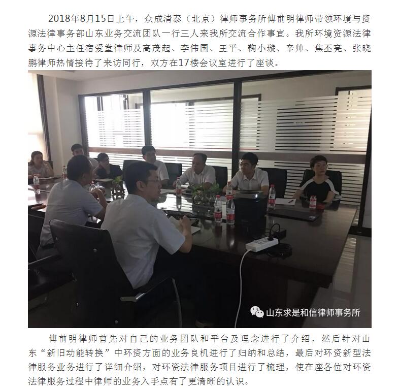 众成清泰(北京)律师事务所环境与资源法律事务部山东业务交流团队傅前明律师一行三人来我所交流合作事宜 来源:求是和信网 日期:2018-08-16 16:34 发布人:qshx 浏览量: 2664 上一篇:求是和信律师篮球联队取得小组赛第二场胜利 下一篇:求是动态 | 我所青年律师闪耀“大成杯”诉辩赛场 专业素养与团队协作铸就卓越战绩