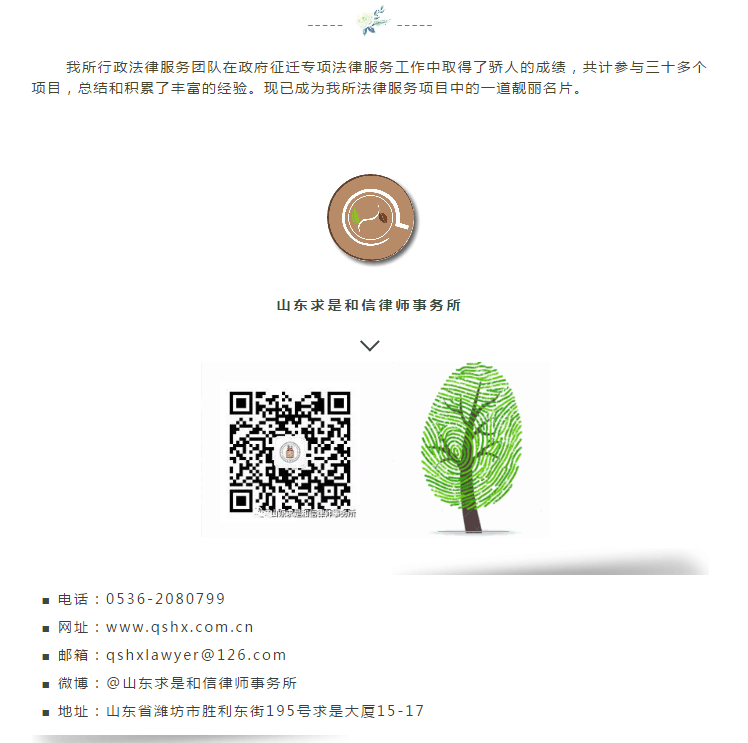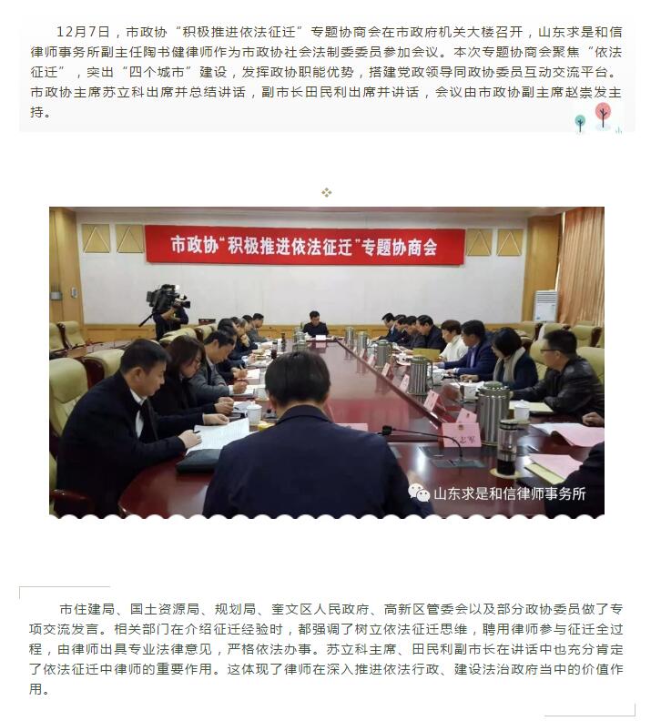 山东求是和信律师事务所副主任陶书健律师参加潍坊市政协 “积极推进依法征迁”专题协商会 来源:求是和信网 日期:2018-12-12 10:04 发布人:qshx 浏览量: 790 上一篇:山东求是和信律师事务所马鸽律师应邀为潍坊农发行金融法律知识大讲堂做专题讲座 下一篇:求是动态 | 我所青年律师闪耀“大成杯”诉辩赛场 专业素养与团队协作铸就卓越战绩
