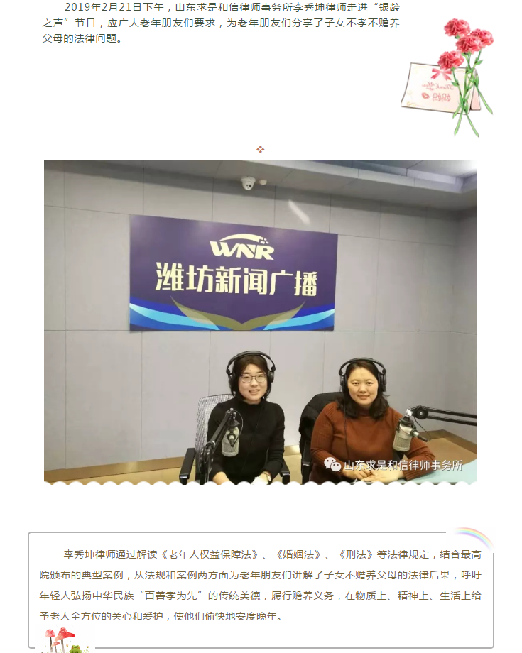 山东求是和信律师事务所李秀坤律师做客“银龄之声”节目 来源:求是和信网 日期:2019-02-25 14:12 发布人:qshx 浏览量: 753 上一篇:山东求是和信律师事务所马东宁主任参加山东省第十三届人民代表大会第二次会议 下一篇:求是动态 | 我所青年律师闪耀“大成杯”诉辩赛场 专业素养与团队协作铸就卓越战绩