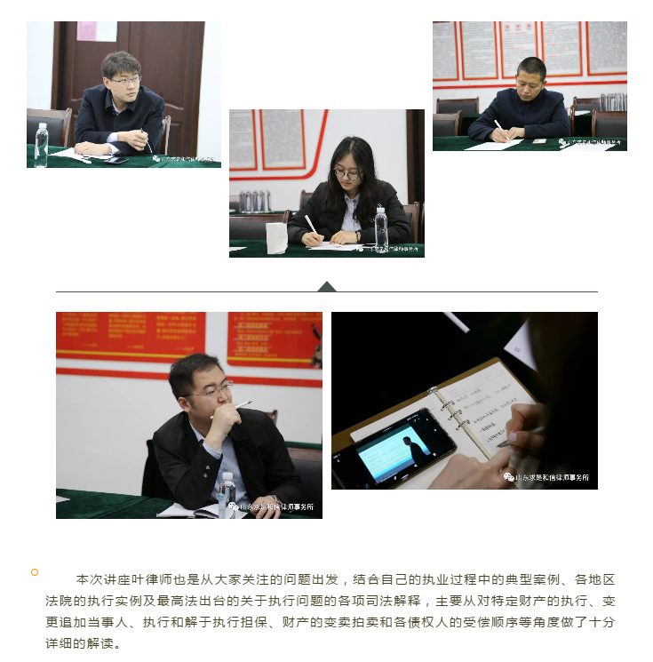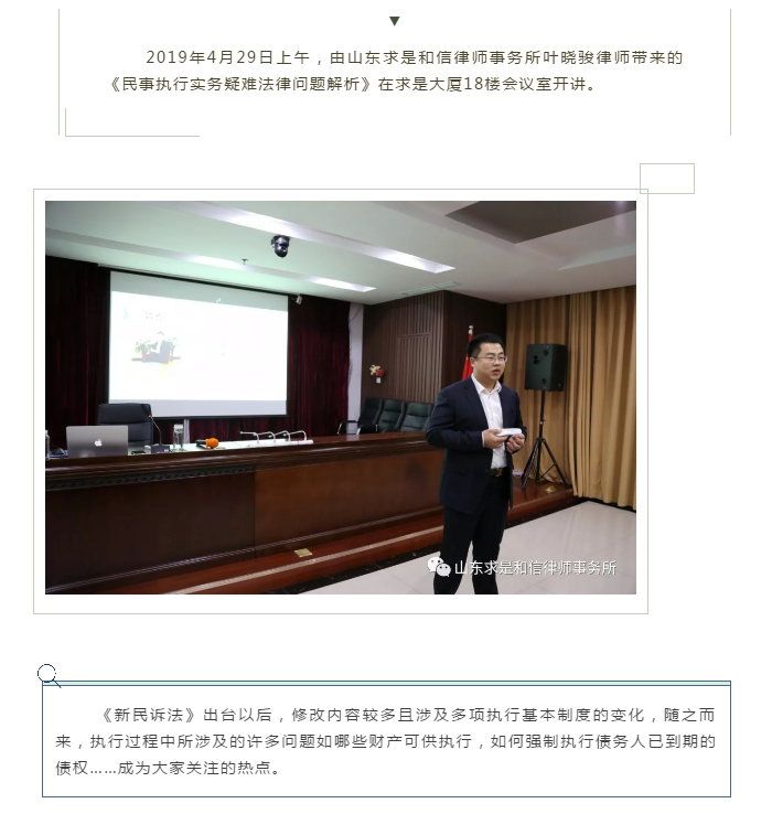 山东求是和信律师事务所公益讲座之《民事执行实务疑难法律问题解析》 来源:求是和信网 日期:2019-05-06 08:40 发布人:qshx 浏览量: 732 上一篇:2019年“求是和信法学教育基金”颁奖仪式暨“潍坊学院法学院-求是和信律师法学讲坛”揭牌活动成功举办 下一篇:求是动态 | 我所青年律师闪耀“大成杯”诉辩赛场 专业素养与团队协作铸就卓越战绩