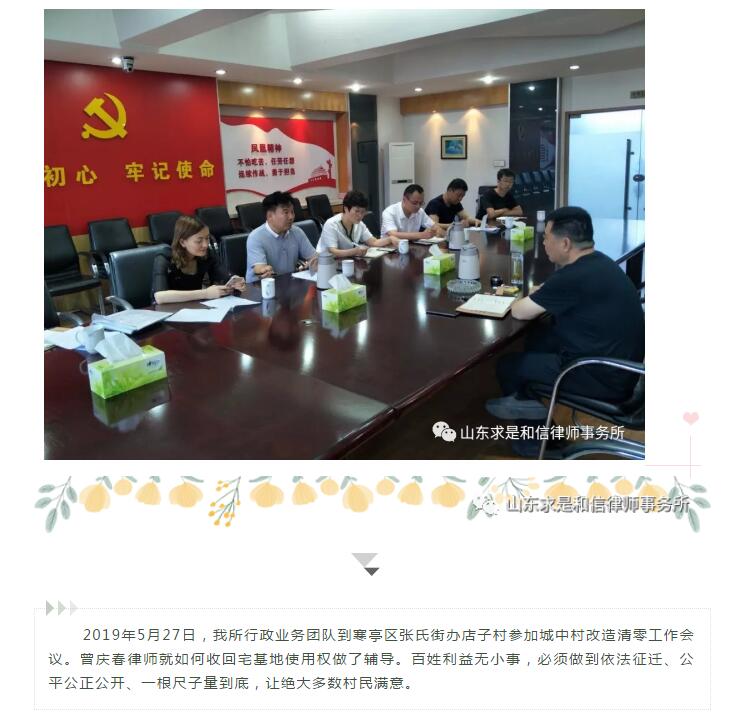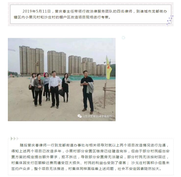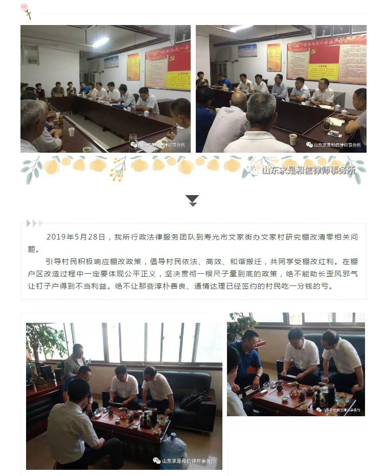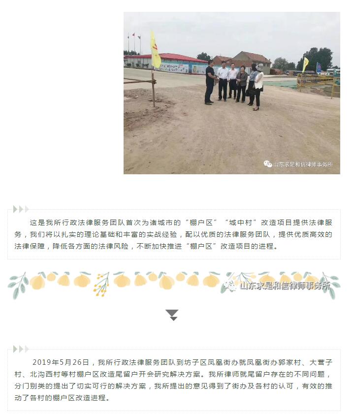 山东求是和信律师事务所行政法律服务团队为诸城、坊子、寒亭、寿光棚户区改造“清零项目”提供法律服务 来源:求是和信网 日期:2019-06-03 11:11 发布人:qshx 浏览量: 886 上一篇:浙江仁谐律师事务所主任刘涛到访山东求是和信律师事务所进行参观交流 下一篇:求是动态 | 我所青年律师闪耀“大成杯”诉辩赛场 专业素养与团队协作铸就卓越战绩