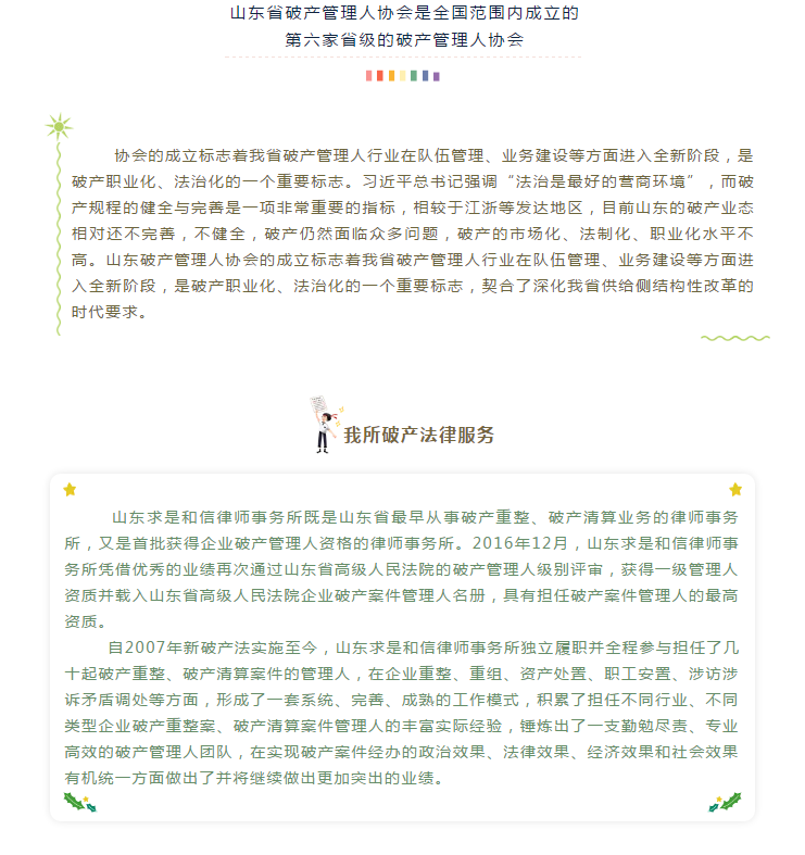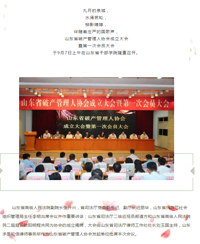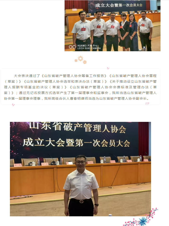 山东求是和信律师事务所当选山东省破产管理人协会理事会理事单位 高级合伙人曹春明律师当选协会副会长 来源:求是和信网 日期:2019-10-14 10:03 发布人:qshx 浏览量: 838 上一篇:山东求是和信律师事务所组织全体员工观看《烈火英雄》 下一篇:求是动态 | 我所青年律师闪耀“大成杯”诉辩赛场 专业素养与团队协作铸就卓越战绩