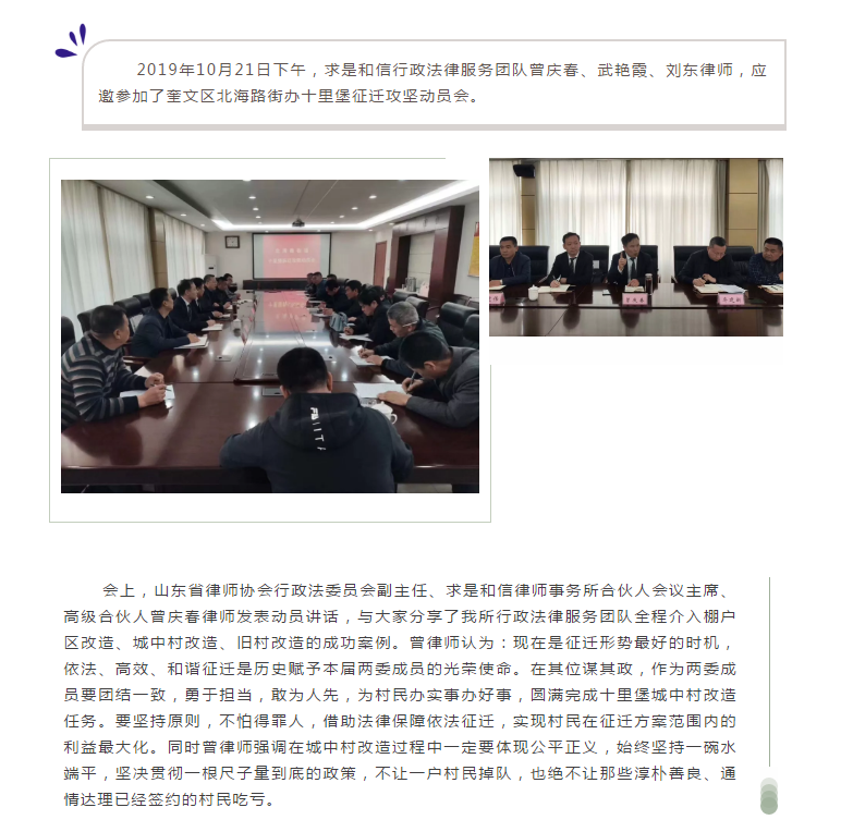 山东求是和信律师事务所行政法律服务团队应邀参加北海路街办十里堡征迁攻坚动员会 来源:求是和信网 日期:2019-10-25 10:47 发布人:qshx 浏览量: 847 上一篇:山东求是和信律师事务所律师参加潍坊市律师协会组织的“潍坊律师金秋徒步行”活动 下一篇:求是动态 | 我所青年律师闪耀“大成杯”诉辩赛场 专业素养与团队协作铸就卓越战绩