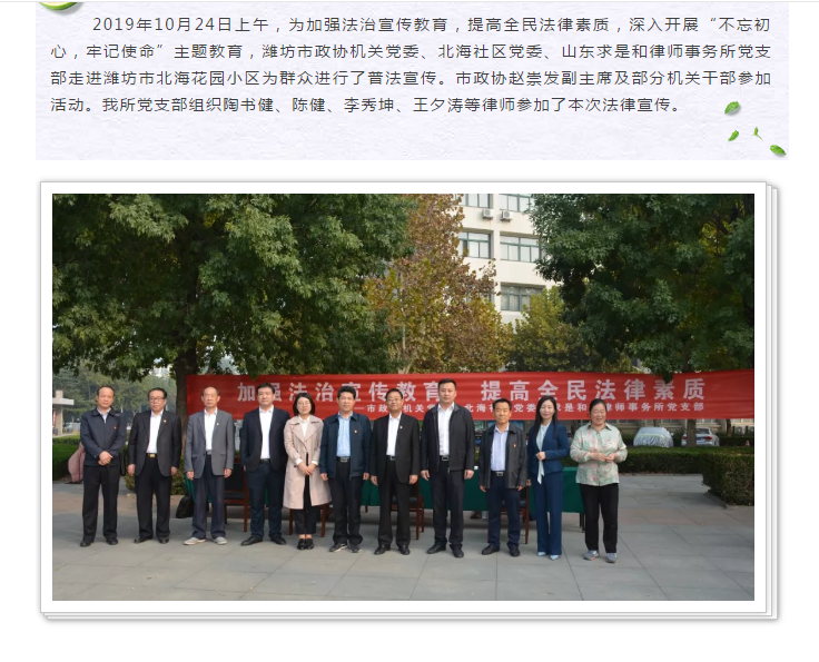 山东求是和信律师事务所党支部与市政协机关党委、北海社区党委走进社区开展宣传普法 来源:求是和信网 日期:2019-10-25 11:18 发布人:qshx 浏览量: 777 上一篇:山东求是和信律师事务所曾庆春律师第三次受邀为全省两公律师进行执业前的集中培训 下一篇:求是动态 | 我所青年律师闪耀“大成杯”诉辩赛场 专业素养与团队协作铸就卓越战绩