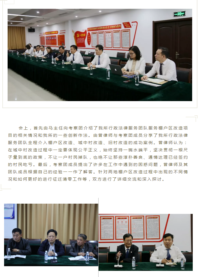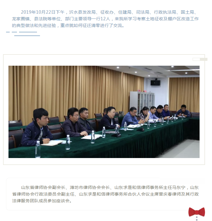 沂水县各级领导来我所就征迁业务进行了交流 来源:求是和信网 日期:2019-10-30 14:35 发布人:qshx 浏览量: 768 上一篇:山东求是和信律师事务所行政法律服务团队受邀参加庄家“城中村”改造动员大会 下一篇:求是动态 | 我所青年律师闪耀“大成杯”诉辩赛场 专业素养与团队协作铸就卓越战绩