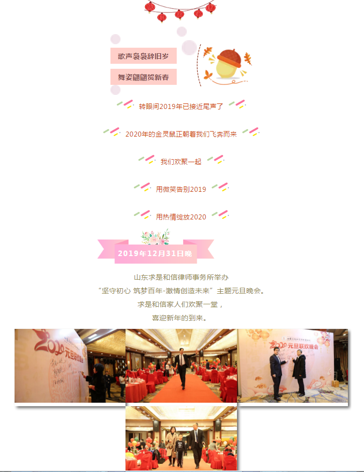 元旦晚会|坚守初心 筑梦百年-激情创造未来 来源:求是和信网 日期:2020-01-03 14:16 发布人:qshx 浏览量: 1118 上一篇:山东求是和信律师事务所主任及多名律师被聘为第五届潍坊仲裁委员会仲裁员 下一篇:求是动态 | 我所青年律师闪耀“大成杯”诉辩赛场 专业素养与团队协作铸就卓越战绩