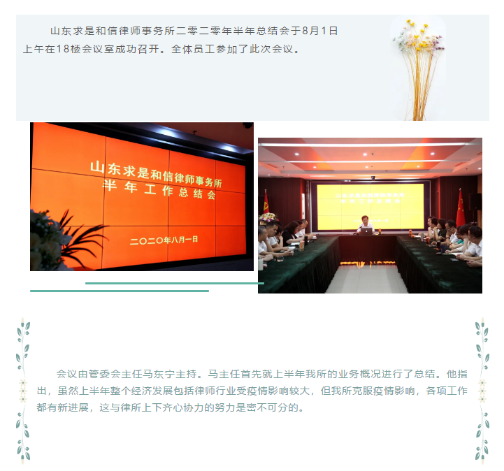 山东求是和信律师事务所二零二零年半年总结会成功召开 来源:求是和信网 日期:2020-08-05 14:53 发布人:qshx 浏览量: 2721 上一篇:山东求是和信律师事务所武艳霞律师应邀到高新区汶泉发展区作宣传贯彻《民法典》专题讲座 下一篇:求是动态 | 我所青年律师闪耀“大成杯”诉辩赛场 专业素养与团队协作铸就卓越战绩