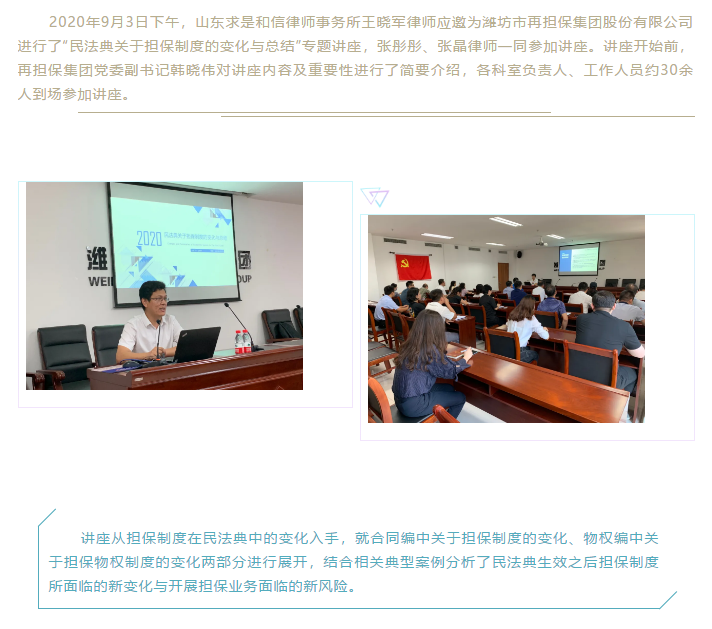 山东求是和信律师事务所王晓军律师应邀为潍坊市再担保集团股份有限公司作《民法典关于担保制度的变化与总结》专题讲座 来源:求是和信网 日期:2020-10-21 14:49 发布人:qshx 浏览量: 2258 上一篇:山东求是和信律师事务所律师参加“庆祝《中华人民共和国仲裁法》实施25周年座谈会” 下一篇:求是动态 | 我所青年律师闪耀“大成杯”诉辩赛场 专业素养与团队协作铸就卓越战绩