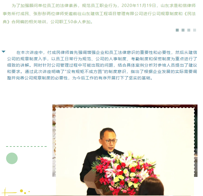 『求是资讯』我所付成民律师、张彤彤律师受邀为建信公司开展法律法规培训 来源:求是和信网 日期:2020-12-23 10:41 发布人:qshx 浏览量: 2718 上一篇:『求是动态』市工商联民法典大讲堂顺利举办,为民营经济保驾护航 下一篇:求是动态 | 我所青年律师闪耀“大成杯”诉辩赛场 专业素养与团队协作铸就卓越战绩