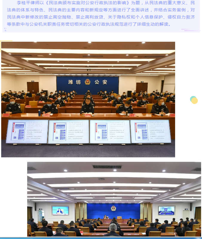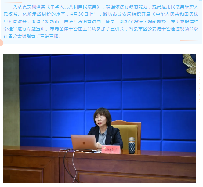 山东求是和信律师事务所李桂平律师应邀为潍坊市公安局全体干警作《民法典》宣讲 来源:求是和信网 日期:2021-05-25 16:47 发布人:qshx 浏览量: 2813 上一篇:我所再次获评一级破产管理人资质!综合评分位列全省第一! 下一篇:求是动态 | 我所青年律师闪耀“大成杯”诉辩赛场 专业素养与团队协作铸就卓越战绩