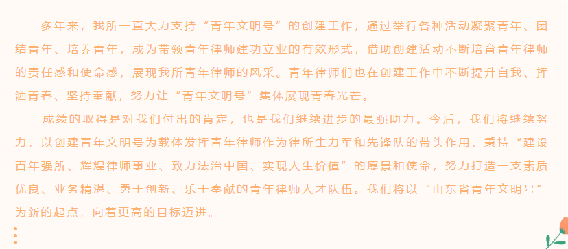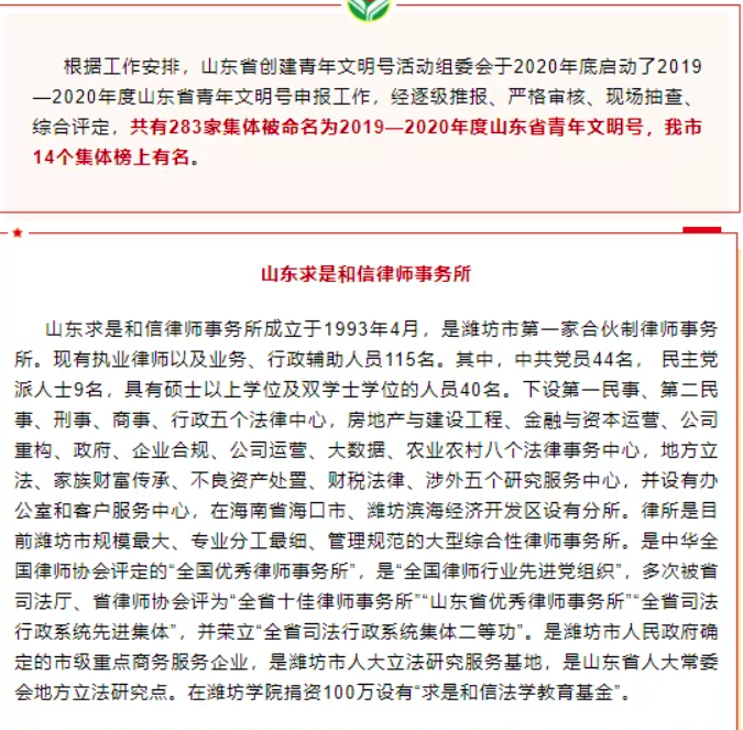 『求是动态』我所蝉联2019—2020年度“山东省青年文明号” 来源:求是和信网 日期:2021-12-07 09:52 发布人:qshx 浏览量: 3598 上一篇:2021年律师职称评审申报公示 下一篇:求是动态 | 我所青年律师闪耀“大成杯”诉辩赛场 专业素养与团队协作铸就卓越战绩