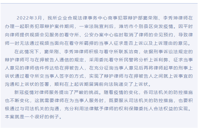 『求是资讯』我所律师克服疫情阻碍积极协助客户实现上诉权利 来源:求是和信网 日期:2022-06-30 10:54 发布人:qshx 浏览量: 676 上一篇:抗击疫情,求是和信党员律师在行动 下一篇:求是动态 | 我所青年律师闪耀“大成杯”诉辩赛场 专业素养与团队协作铸就卓越战绩