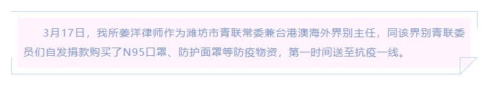『求是资讯』我所姜洋律师同潍坊市青联台港澳海外界别人士向防疫一线捐赠物资 来源:求是和信网 日期:2022-06-30 10:55 发布人:qshx 浏览量: 763 上一篇:『求是资讯』我所律师克服疫情阻碍积极协助客户实现上诉权利 下一篇:求是动态 | 我所青年律师闪耀“大成杯”诉辩赛场 专业素养与团队协作铸就卓越战绩