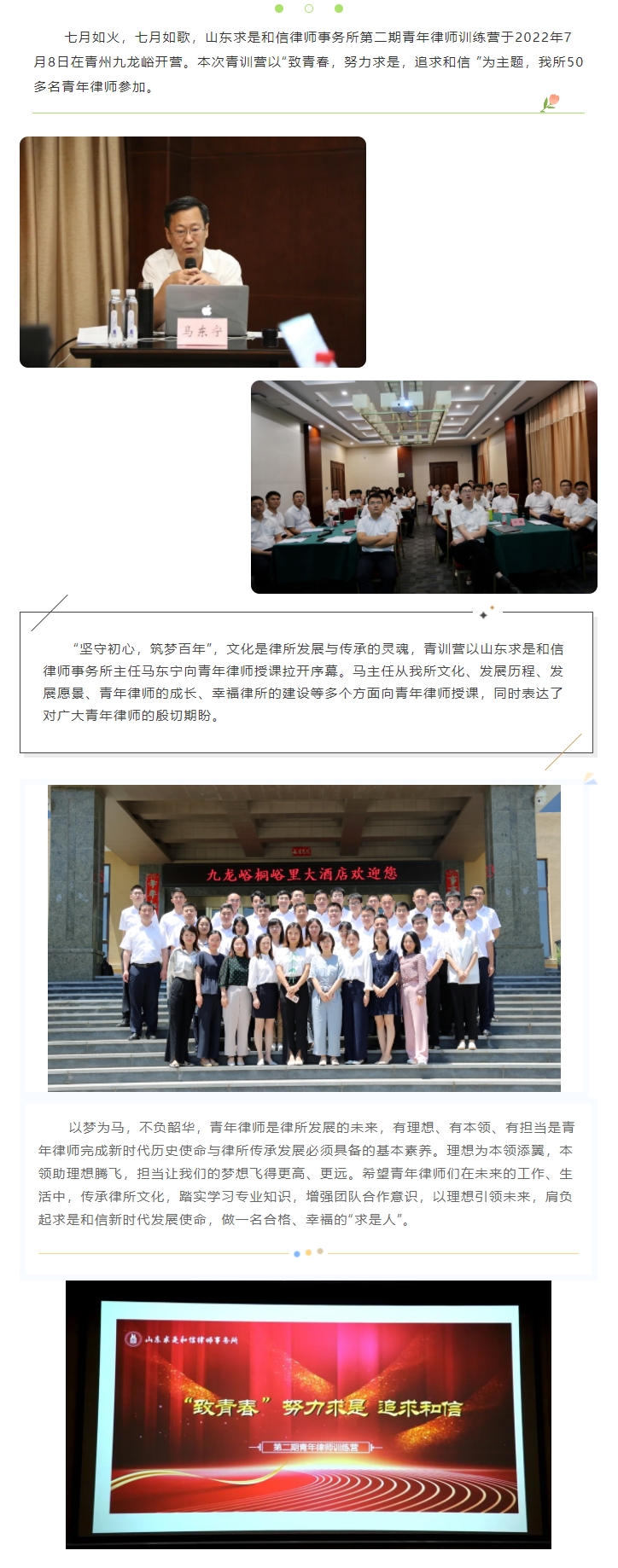 求是动态 | 我所第二期青年律师训练营隆重开营 来源:求是和信网 日期:2022-07-08 09:43 发布人:qshx 浏览量: 737 上一篇:求是动态 | 2022年上半年求是和信企业合规业务发展综述 下一篇:求是动态 | 我所青年律师闪耀“大成杯”诉辩赛场 专业素养与团队协作铸就卓越战绩