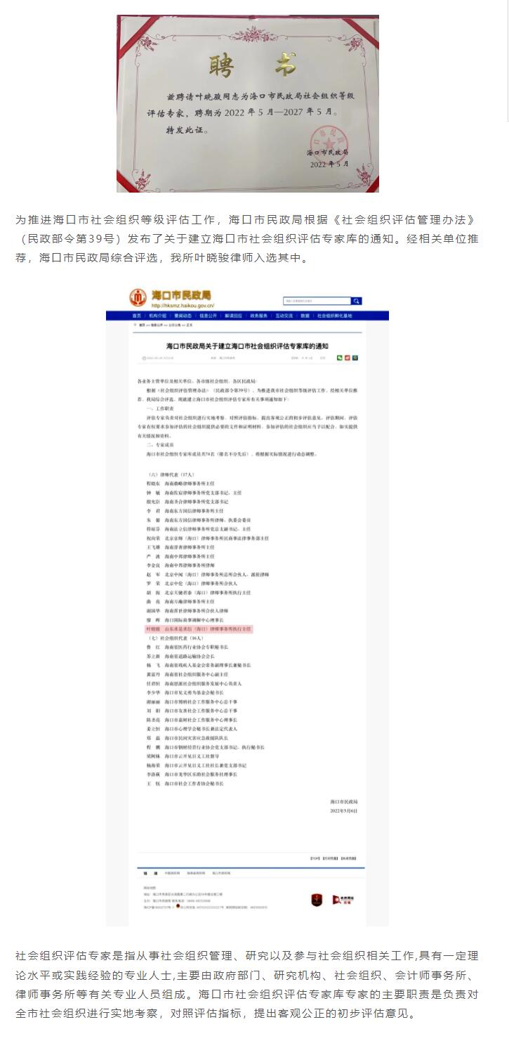 求是动态 | 叶晓骏律师入选海口市社会组织评估专家库专家 来源:求是和信网 日期:2023-01-16 16:24 发布人:qshx 浏览量: 1351 上一篇:求是动态 | 山东求是和信律师事务所合伙人会议第四十五次会议成功召开 下一篇:求是动态 | 我所青年律师闪耀“大成杯”诉辩赛场 专业素养与团队协作铸就卓越战绩