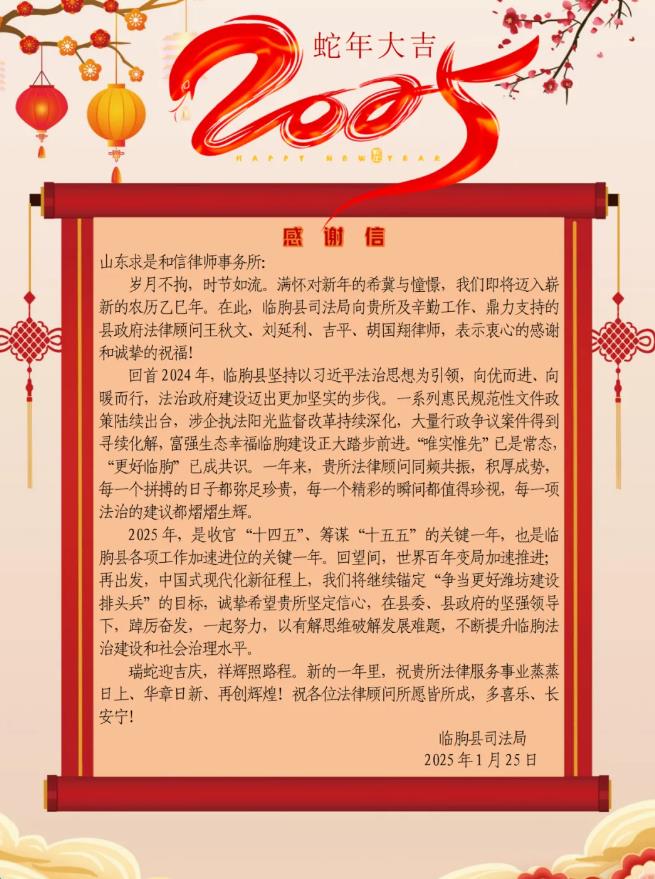 来源:求是和信网 日期:2025-02-10 09:05 发布人:qshx2025 浏览量: 1664在2025新春佳节到来之际,临朐县司法局、峡山区党工委政法委分别向山东求是和信律师事务所发来感谢信,充分肯定了山东求是和信律师事务所在政府法律顾问、信访案件化解、突发事件处置、民事及行政诉讼代理等专业法律服务领域做出的奉献,并祝愿山东求是和信律师事务所及全体员工新春快乐。