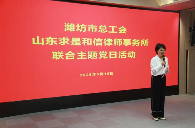 来源:求是和信网 日期:2025-05-27 15:10 发布人:qshx2025 浏览量: 1423近日,潍坊市总工会党组成员、副主席宋乐昌一行50余人莅临山东求是和信律师事务所,开展党建共建主题讲座与参观交流活动。本次活动以“党建共建、法律赋能工会工作”为主题,双方通过党建共建,深度交流与专业分享,体现了潍坊市总工会对全市广大工会组织及职工的关怀与厚爱,展现了求是和信在劳动法律领域的专业实力与服务成果。