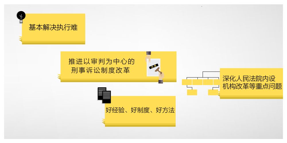 着眼于推进“基本解决执行难”、推进以审判为中心的刑事诉讼制度改革、深化人民法院内设机构改革等重点问题,复制推广好经验、好制度、好方法。