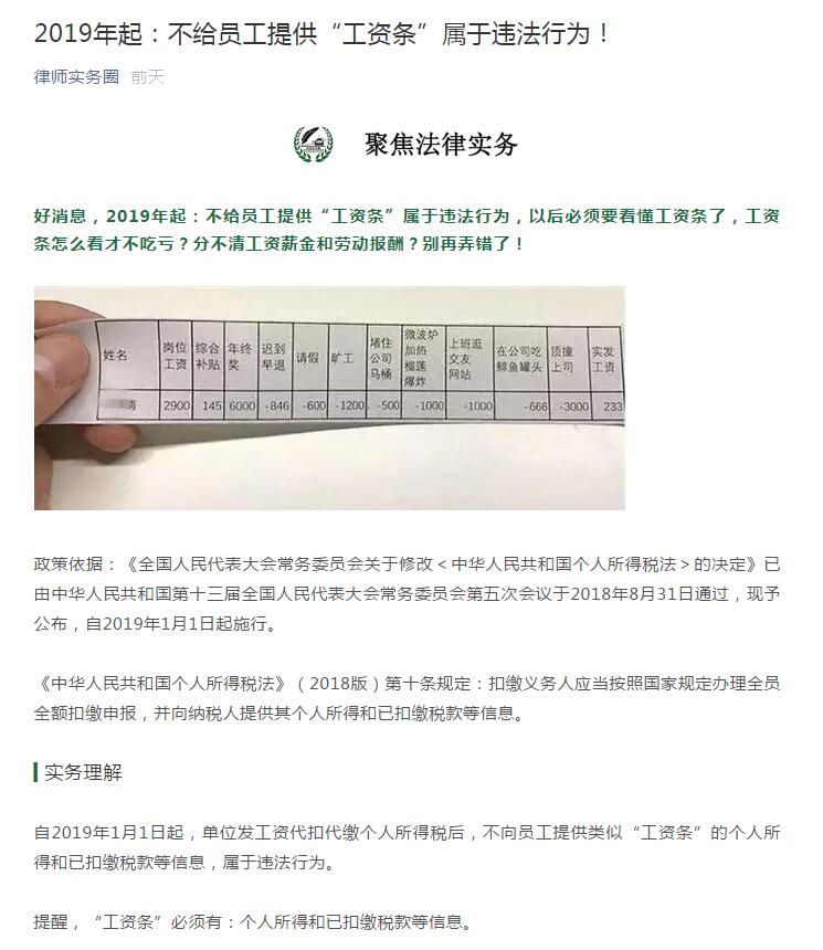 2019年起:不给员工提供“工资条”属于违法行为! 来源:求是和信网 日期:2018-10-12 16:15 发布人:qshx 浏览量: 745 上一篇:中国公安部部署重拳打击食品药品农资环境犯罪 下一篇:最高法发文全方位加强对执行权的监督制约