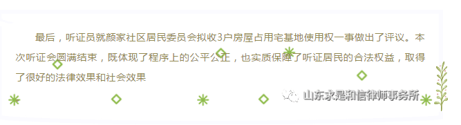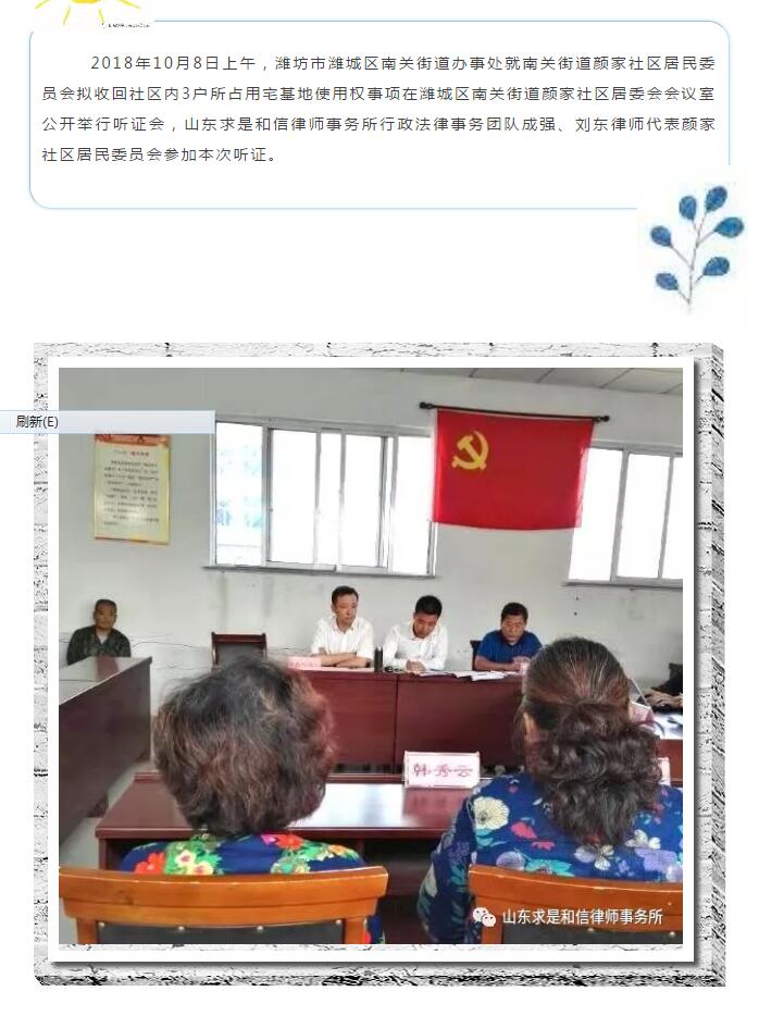 山东求是和信律师事务所成强、刘东律师参加潍城南关街道颜家社区收回宅基地使用权听证会 来源:求是和信网 日期:2018-10-15 14:39 发布人:qshx 浏览量: 654 上一篇:最高院案例裁判要旨:买卖违法建筑的合同是否有效? 下一篇:最高法发文全方位加强对执行权的监督制约