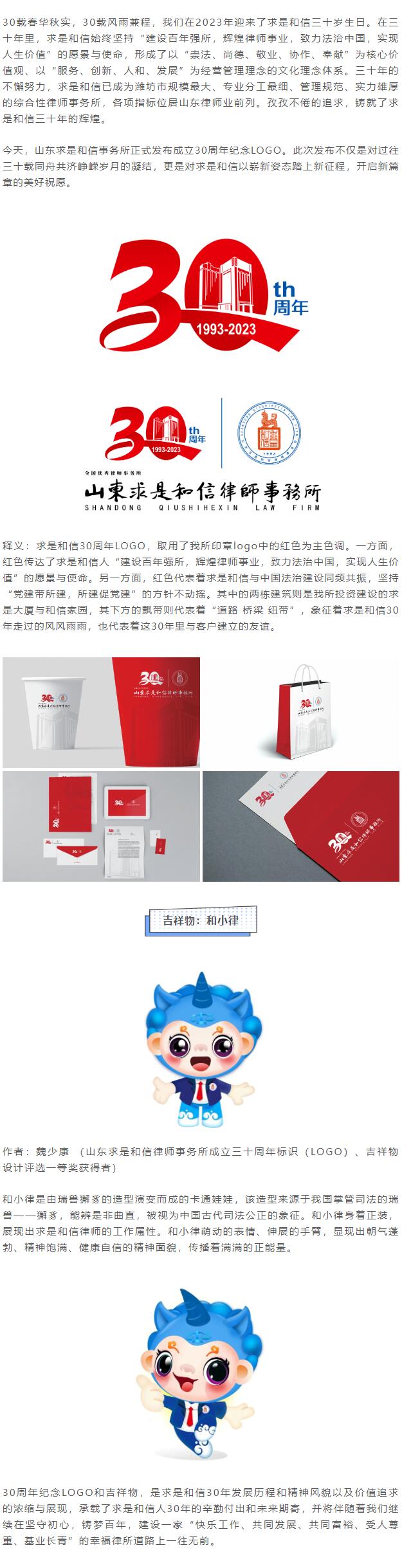 求是和信30年 | 山东求是和信律师事务所30周年纪念LOGO、吉祥物发布 来源:求是和信网 日期:2023-03-10 16:10 发布人:qshx 浏览量: 6327 上一篇:已经没有了 下一篇:求是和信30年 | 热烈祝贺山东求是和信律师事务所成立三十周年