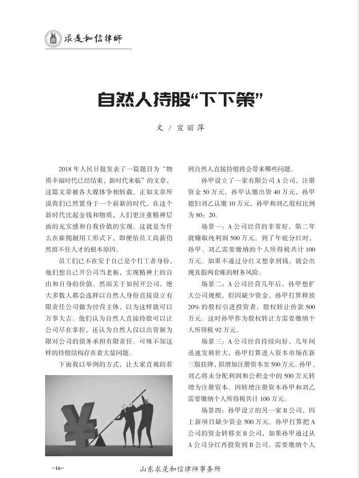 自然人持股“下下策” 来源:求是和信网 日期:2019-07-23 11:48 发布人:qshx 浏览量: 1826 上一篇:税务新规下个人所得如何进行合法节税筹划? 下一篇:履行职责诉讼的类型和裁判方式研究