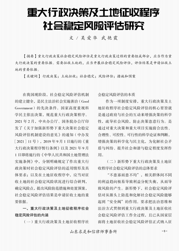 重大行政决策及土地征收程序社会稳定风险评估研究 来源:求是和信网 日期:2022-01-10 11:08 发布人:qshx 浏览量: 4742 上一篇:『实务研究』供销社系统人员职务犯罪主体身份认定的几个问题 下一篇:履行职责诉讼的类型和裁判方式研究