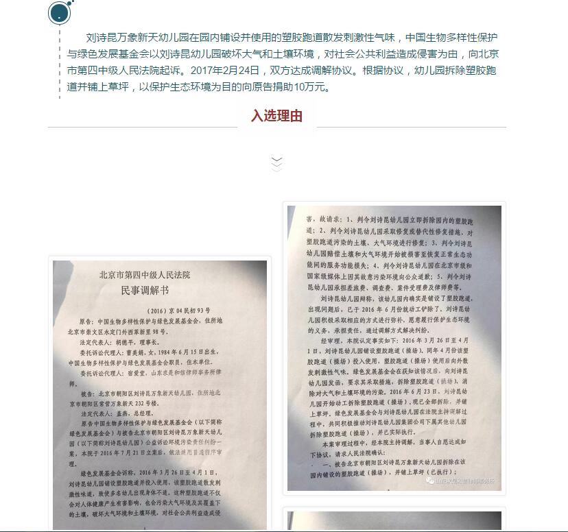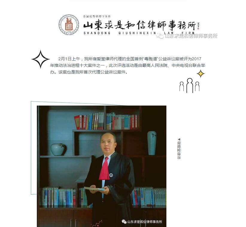 山东求是和信律师事务所宿爱堂律师代理的全国首例“毒跑道”公益诉讼案被评为2017年推动法治进程十大案件之一 来源:求是和信网 日期:2018-03-05 11:44 发布人:qshx 浏览量: 1297 上一篇:潍坊市法学会知识产权法学研究会 2018年工作研讨会在山东求是和信律师事务所成功举行 下一篇:求是动态 | 我所青年律师闪耀“大成杯”诉辩赛场 专业素养与团队协作铸就卓越战绩