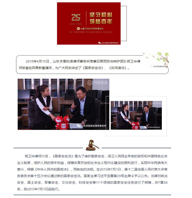 山东求是和信律师事务所杨卫华律师受邀在网易直播公易课宣讲国家安全法知识